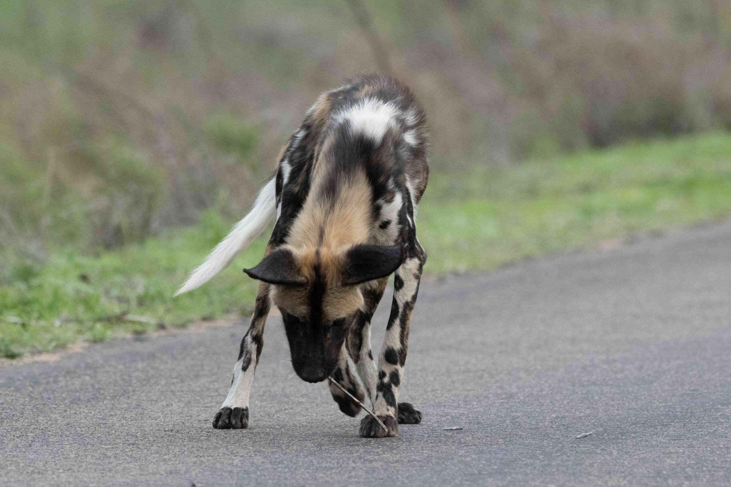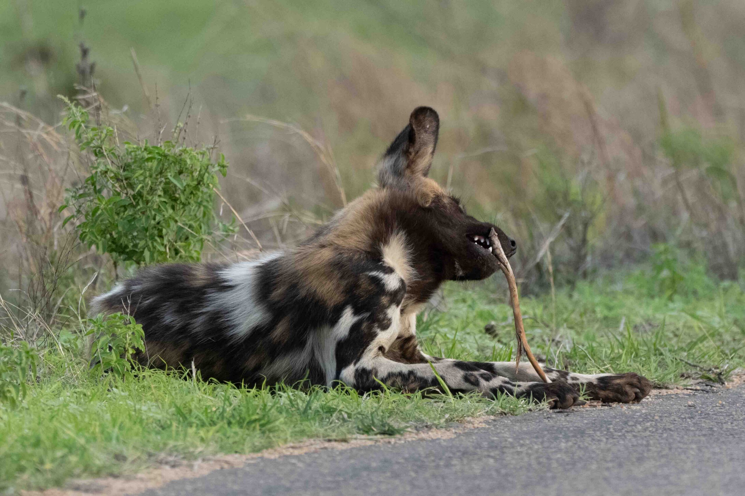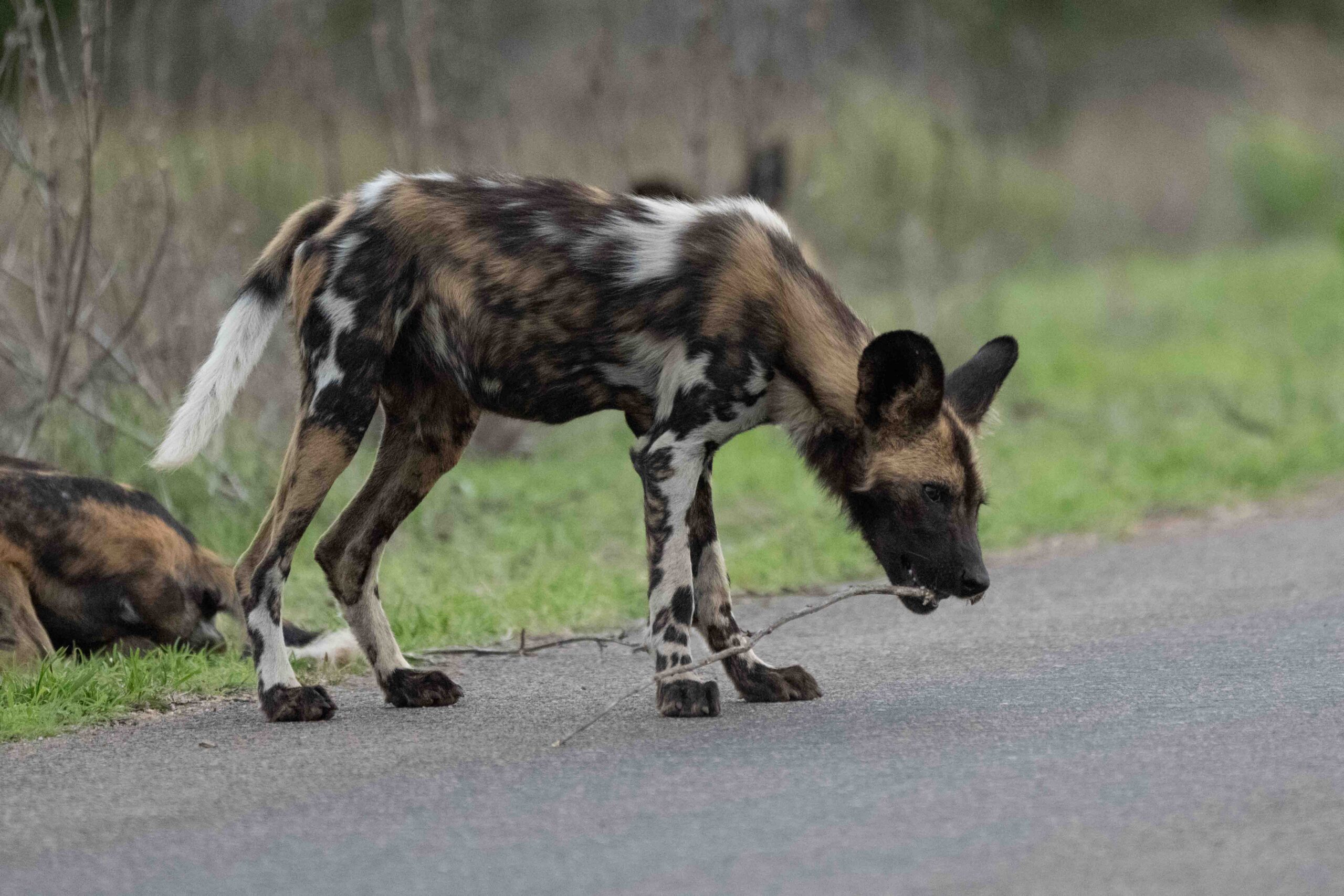 Young African Wild Dog with his toy stick