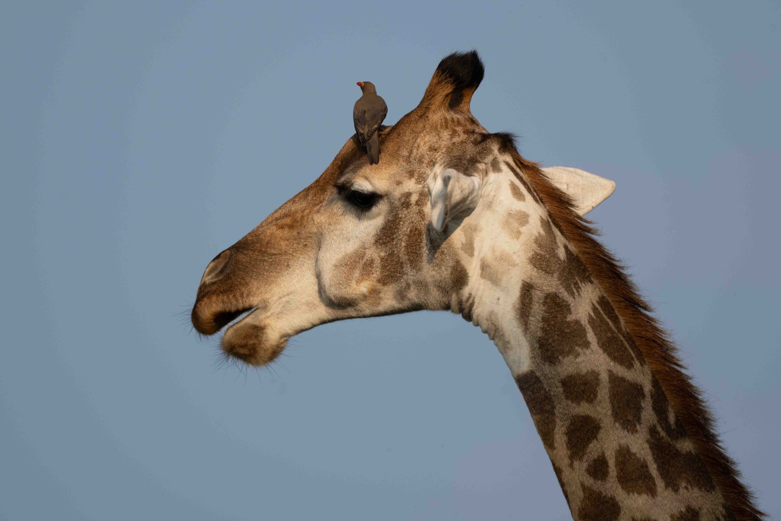 The usual suspect, the Red-billed Oxpecker, sitting on the giraffe’s head.